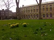 Its current name refers to the Collegiate Church of St. Peter, Westminster Abbey, rather than to its component Westminster School of which Lord Burlington's College Dormitory building forms the west side. The north side is formed by the great hall of Westminster School (originally the monks' dormitory), and the houses of the abbey canons; the east and south sides are a medieval wall with a watergate which formerly opened into the River Thames, now embanked 50 metres away beyond the House of Lords.