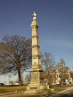 Between the cathedral and the high school sits the Civil War Soldier's monument in the middle of Main Street. The monument is a stone obelisk topped by a statue of a soldier, which faces south towards the Mississippi River in the valley below. Battles in which local soldiers fought are engraved on each side of the obelisk in two rows. The battles listed are: Shilo, Donelson, Wilsons Creek, Fort Blakely, Corinth, Prairie Grove, and Vicksburg. It was built in 1880, and listed on the Davenport Register of Historic Properties in 1993.[15][16]