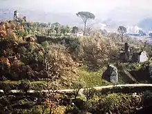 The hill where the town of ancient Cerreto stood, destroyed by the earthquake of June 5, 1688. The ruins of the medieval keep can be seen in the upper left. The church of San Martino stood in the center of the walled village.