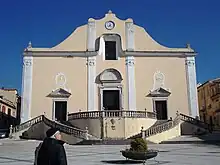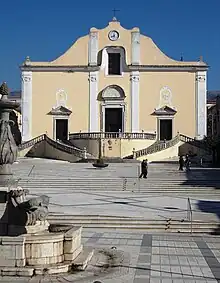 The collegiate church, characterized by the external stone staircase that divides into four branches, with its 2,000 m2 (22,000 sq ft) of surface area, 58.5 m (192 ft) in length, 32.4 m (106 ft) in width and 25 m (82 ft) in height, is the largest church in the diocese of Cerreto Sannita-Telese-Sant'Agata de' Goti.[1] Inside it are preserved numerous 18th-century paintings, valuable wooden statues, some ancient Cerretese ceramic floors, a 19th-century organ in a Baroque case, and some altars made of inlaid polychrome marble.