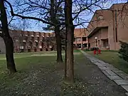 The campus, designed by the architect Marco Zanuso,[6] is surrounded by a 30,000 square meters park. The complex was built between 1971 and 1974 and was originally intended to host the Center for economic relief for African countries (also known as FinAfrica) that for years welcomed international students specializing in the banking and financial sectors of developing nations. The Collegio's original building design evokes the brutalism of Andrew Melville Hall designed by James Stirling and built in 1967 for St. Andrews University.[7]