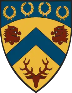 Or a chevron Azure between in chief two lions' heads erased and respectant and in base a stag's head caboshed Gules on a chief enarched Azure three laurel wreaths Or.