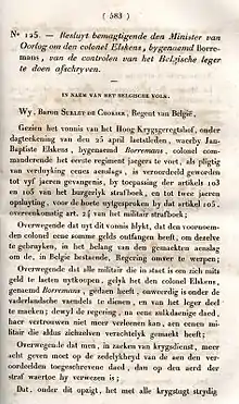 When it became obvious that the provisional government and the National Congress, established by the southern rebels after having overthrown the legitimate regime in this part of the Kingdom, were incapable of generating any credibility either with the press or with the intimidatory French schemers who were dedicated to agitating loudly in the public gallery during gatherings of the Congress occupied with drafting the new constitution and with the candidacy to the Belgian throne of the Duke of Nemours, son of the new king of France, Louis-Philippe, the Orangist faction in the southern part of the Netherlands was able to easily increase its public support. The Orangists created a network that was able to re-establish the legitimate regime, a network in which were represented, among others, the former Minister Gobbelschroy, an industrialist from Liège John Cockerill, the commander of the troops of the provisional government in Bruges Ernest Grégoire, the chief of the home guard Baron Emmanuel d‘Hoogvorst and his brother Joseph, Charles Morel and the Generals Goblet and Van der Smissen. Faced with the ineffectiveness of the new administration, Colonel Borremans decided to join this network of resistants. For the Orangists, the decision to revolt was caused when Minister Alexandre Gendebien founded, on 23 March 1831, the day of his resignation, the National Association - a clique orientated towards France that, if it did not succeed in spite of all its scheming in getting Belgium annexed by France, strived all the same to reduce the Southern Netherlands to a satellite state of the Kingdom of Louis-Philippe. The Association decided to organise a meeting on 24 March at the Vauxhall in Brussels’ public park. As one of the measures to liberate the country, the Orangist's network decided to send Colonel Borremans, Chief of the Hunters and Brussels born, to the public houses to recruit partisans to disrupt the meeting of the Association. The Colonel was regarded as imprudent when he pleaded openly for the return of the Prince of Orange, the future Willem II of the Netherlands, and proved to be incapable of warding off the empty but impressive rhetoric of the leaders of the Association. As his persuasive strength had eluded him, he and is adherents had to leave the meeting without having achieved any success. As the military intervention had not yet taken place, Colonel Borremans had to find some sympathisers in his district of the Old Grain Market Square the next evening to support the insurrection. The Colonel was in a state of despair after the failure of the previous day which made him surrender to the police of the new government, which of course was a disaster for the Orangist party. The English Envoy, Lord Ponsonby, then recommended that the Orangists cancel their counter coup. Most members of the resistance were able to escape, but Colonel Borremans was summoned before a Military Court and convicted. On 31 May 1831, he was stripped of his military ranks by a superior Military Court due to "the non denunciation of a plot against the security of the Belgian state". His conviction led to anti-Orangist riots. The regiment itself had been transferred to Aalst - Dendermonde. Borremans, having always denied the accusations, was pardoned on the occasion of the marriage of Leopold I, who meanwhile had accepted the throne of the Belgian Kingdom. Borremans was freed from gaol only in September 1832.