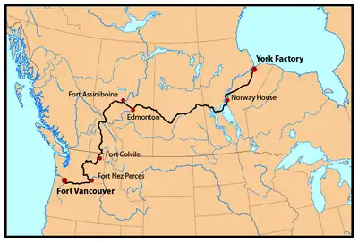 The Hudson's Bay Company York Factory Express, overland route to Fort Vancouver, evolved from an earlier express brigade used by the North West Company between Fort Astoria (renamed Fort George) to Fort William on Lake Superior. By 1825 there were usually two brigades, each setting out in spring from opposite ends of the route, Fort Vancouver, and York Factory on Hudson Bay, and passing each other in the middle of the continent. Each brigade consisted of about forty to seventy five men and two to five specially made boats and traveled at breakneck speed (for the time). Indians along the way were often paid in trade goods to help them portage around falls and unnavigable rapids. An 1839 report cites the travel time as three months and ten days—almost 26 miles (40 km) per day on average.[7] This established a 'quick' (about 100 days for 2600 miles (4200 km)) way to resupply their forts and fur trading centers as well as transmitting messages between Fort Vancouver and York Factory on Hudson Bay.