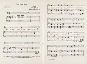 "Roar, Lion, Roar" is the primary fight song for the Columbia Lions. Its lyrics were written by Corey Ford, while the music was composed by Morris W. Watkins and Roy Webb. It was originally written for the 1923 Varsity Show, Half Moon Inn, and is often sung at sporting events.[28]
