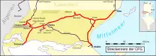 After work began on expanding and modernizing the port of Sfax the government dropped the port construction requirement and allowed a concession to mine the ore and transport it by rail to Sfax.[2] The Compagnie de Phosphate de Gafsa et de Chemin de Fer de Gafsa (CPGCFG, Gafsa Phosphate and Railway Company) was formed in 1897 by a group that included the Saint Gobain Chemical Company, Mukhtar Hadid Mining Company, Duparchy Company, several major French industrialists and many small investors.[2] At the same time construction began of a railway line to link Metlaoui to Sfax.[1]