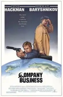 Company Business is a 1991 action film, written and directed by Nicholas Meyer and starring Gene Hackman and Mikhail Baryshnikov. The film follows the exploits of Sam Boyd (Gene Hackman), a former operative for the CIA who is reactivated to escort Pyotr Ivanovich Grushenko (Mikhail Baryshnikov), a captured KGB mole, to a prisoner exchange in recently reunited Berlin.