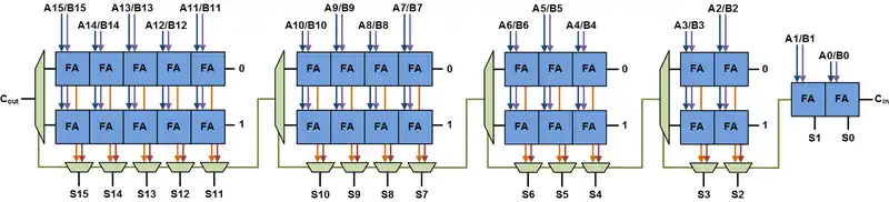 In electronics, a carry-select adder is a particular way to implement an adder, which is a logic element that computes the -bit sum of two -bit numbers. The carry-select adder is simple but rather fast, having a gate level depth of .