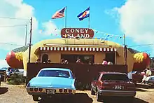 Coney Island Colorado (commonly The Coney Island) in Bailey, Colorado, is a 1950s diner shaped like a giant hot dog, with toppings. The building has been called "the best example of roadside architecture in the state".[1]