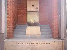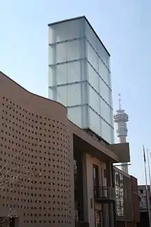 The court building was constructed using bricks from the demolished awaiting-trial wing of the former prison. Most of the prison was demolished to make way for the new court, but the stairwells were kept and incorporated into the new building as a reminder of the Constitution's transformative aspirations. Inside the main room, a row of horizontal windows has been set up behind the seats of the judges. While the windows are at head-height on the inside, they are on ground level on the outside. Those sitting in the court consequently have a view of the feet of passersby moving along, above the heads of the judges, to remind them that in a constitutional democracy the role of judges is to act in the interests of the people of the nation, rather than in their own self-interest.[3] The first court session in the new building at this location was held in February 2004. The court building is open to the public who want to attend hearings or view the art gallery in the court atrium. The court houses a collection of more than 200 contemporary artworks chosen by Constitutional Court judge Albie Sachs, including works by Gerard Sekoto, William Kentridge, and Cecil Skotnes.