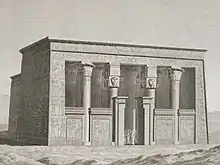 The temple built together with these mentioned structures includes, positioned on the overhanging eaves, a globe with wings outstretched to either side. The walls of the building were found covered with hieroglyphic writing. Of the names amongst them, the earliest of these showed Cleopatra Cocce (Cleopatra III),[7] and her son Ptolemy Soter, the most recently written showed the name of Emperor Commodus,[8] the decorations were made between the reign of Cleopatra III and Soter II.[5]