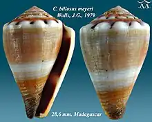 - Conus biliosus meyeri Walls, 1979 (synonym: Lividiconus meyeri (Walls, 1979); Splinoconus biliosus meyeri (Walls, 1979)· accepted, alternate representation)