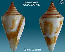 - 1 2 Bouchet, P. (2011). Conus paraguana Petuch, 1987. Accessed through: World Register of Marine Species at http://www.marinespecies.org/aphia.php?p=taxdetails&id=429456 on 2012-01-21