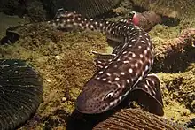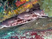 The elongated body of the coral catshark allows it to move into and through small spaces in the reef environment, though it does not "crawl" using its pectoral and pelvic fins like the epaulette shark (Hemiscyllium ocellatum).[9] It is primarily crepuscular and nocturnal, with active foraging activity beginning in the afternoon and ending before sunrise. During the day, it generally hides under shelter such as reef overhangs or sunken logs, either singly or in groups. Individual sharks may return to the same hiding place on successive days. This species feeds on small benthic invertebrates and bony fishes; captive specimens have been observed lying still and lunging at prey that comes into range.[11][14]