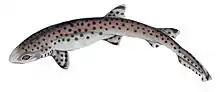 The pectoral fins are fairly large. The first dorsal fin is angled backwards and originates over the rear of the pelvic fin bases; the second dorsal fin is similarly shaped and slightly smaller than the first, and originates over the front quarter of the anal fin base. Adult males have thin, tapering claspers that extend about two-thirds of the distance between the pelvic and anal fins. The anal fin is much smaller than the dorsal fins. The caudal fin is relatively short and broad, with an indistinct lower lobe and a ventral notch near the tip of the upper lobe. The skin is thick and covered by well-calcified dermal denticles.[8] Extremely variable in coloration, the coral catshark lacks prominent saddle markings, but rather has many black and white spots on a grayish background. These spots often run together to form horizontal dashes, which include white tips on the dorsal fins and a white stripe through the gill slits. The underside is plain white.[9][10] This species grows up to 70 cm (28 in) long.[2]