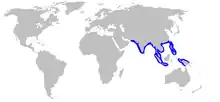 The most widely distributed member of its genus, the coral catshark can be found from Pakistan and India to Southeast Asia and Taiwan, including the Philippines and New Guinea.[11] Its range extends as far north as the Ryukyu Islands.[12] Early records from Australian waters are in fact of the related Australian marbled catshark (A. macleayi) and banded sand catshark (A. fasciatus).[13] Common and bottom-dwelling in nature, the coral catshark inhabits inshore coral reefs at depths not exceeding 15 m (49 ft).[11]