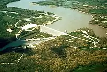 Coralville incorporated as a city on June 1, 1857. The city's name is derived from the fossils that are found in the limestone along the Iowa River. In 1864, Louis Agassiz, a Harvard University zoologist, gave a lecture at the nearby University of Iowa titled "The Coral Reefs of Iowa City".[3] During the lecture, he presented local samples of fossilized Devonian period coral.[4] The lecture was well received and helped raise public interest in the local fossils. In 1866, more corals were discovered at the site of a new mill, inspiring the citizens of the area to name the settlement "Coralville".[5] The first mill at Coralville was built in 1844, and in the years that followed, a number of watermills were powered by the Coralville mill dam along the Iowa River,[6] but all of the mills had closed by 1900, except for a low-head hydroelectric plant that remained in operation until the mid 20th century.