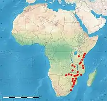 Cordyla africana is a tall (up to 25 m), deciduous African tree with a large, spreading, much-branched crown, and a bole of some 2.2 m dbh. It is a member of the large leguminous family Fabaceae, and is known as wild mango in some areas. It is found up to 1000m elevation in large river valleys, in miombo woodland and coastal swampy evergreen forest, mostly on sandy soils, along the eastern parts of central and southern Africa. It occurs in South Africa in KwaZulu-Natal and Mpumalanga provinces, the Kruger National Park, Eswatini, Mozambique, Zimbabwe, Zambia, Malawi, Kenya and Tanzania.[1] 'Cordyla' is from the Greek word 'kordyle', meaning a 'club' and is a reference to the club-shaped fruit and stalk.[2]