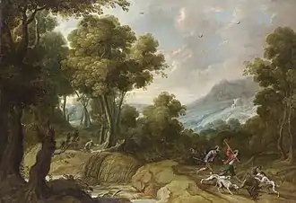 He collaborated with van Dyck as well as with other Flemish artists such as the landscape painter Jan Wildens.[15] Collaborations with local artists were also frequent. De Wael or someone from his circle painted the staffage in the landscapes of the Italian landscape painter Giovanni Battista Vicino.[5][9] In many of his battle scenes and harbour views his brother Lucas painted the landscapes while Cornelis in turn added the figures to Lucas' paintings.[16]