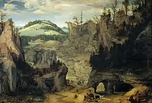 The early 17th century artist biographer Karel van Mander called van Dalem an excellent painter of rocks ('fraye schilder van rotsen').[9] And indeed several of his landscape paintings feature extensive rock parties with grottos. Examples are the Landscape with Adam and Eve of 1564 (Iris & B. Gerald Cantor Center for Visual Arts) and the Landscape with herders of c. 1560 (Prado Museum). Van Dalem's rock landscapes often include a grotto where some human activity is going on. These works had an influence on Joos de Momper who was an important adept of the genre and created about 70 paintings of this motif.[10]