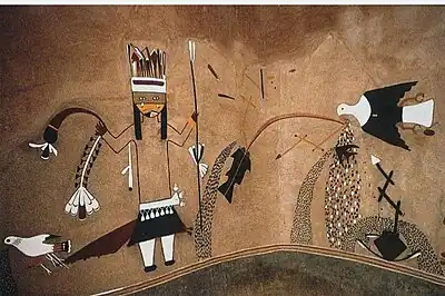 The ruins of Kuaua Pueblo were excavated from 1934 to 1939[7] by an archaeological team led by Edgar Lee Hewett and Marjorie F. Tichy (later Lambert). The excavation revealed a south-to-north development over the village's three centuries of existence, as well as six kivas built in round, square and rectangular shapes. The site is particularly noted for a series of pre-contact (pre-1541) murals that were recovered from a square kiva in the pueblo's south plaza. These murals represent one of the finest examples of pre-contact Native American art to be found anywhere in North America.