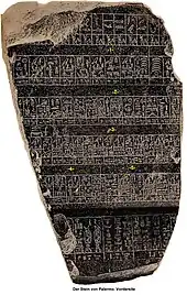 The most important sources of information about accessions to the throne and coronation ceremonies are the inscriptions of the Palermo stone, a black basalt stone slab listing the kings from the 1st Dynasty down to king Neferirkare Kakai, third pharaoh of the 5th Dynasty. The stone also records various events during a king's reign, such as the creation of statues, city and domain foundations, cattle counts and religious feasts such as the Sed festival. The stone also gives the exact date of a ruler's accession to the throne. The first year of a ruler on the throne, the "year of coronation", was not counted in a king's regnal year count, and the stone mentions only the most important ceremonies that took place in this year.[1][2][3][4]