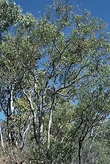 Corymbia jacobsiana, commonly known as Jacob's bloodwood or stringybark bloodwood,[2] is a species of tree that is endemic to the Northern Territory. It has rough, stringy bark on the trunk and branches, lance-shaped to elliptical or curved adult leaves, flower buds in groups of three or seven, creamy white flowers and urn-shaped fruit.