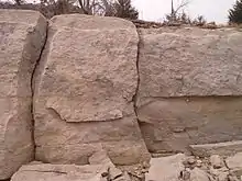 A regionally famous construction material, Cottonwood Limestone is yellowish, buff, to nearly white in color, even-textured, durable, and very suitable for cutting into dimensional stone for masonry. Moreover, its beds of usable stone are particularly massive for the region; blocks of stone three or more feet thick and several feet in length and width can be taken from a ledge.[7] While many other limestone formations are found in the region and have been widely used in local construction, most (excepting most notably the Fort Riley Limestone[8]) weather poorly, lie with much thinner parting beds, or are generally much higher in the typical Permian silica or flint content and so are much more difficult to cut or sculpt.[3] As such, the lithologic characteristics of Cottonwood Limestone has made it one of the best building stones in the state and many past quarries, large and small, may be found on nearly every hill capped by this resource.[2]