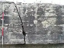 A longitudinal-section of siliceous nodule seen in split face blocks.