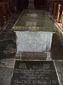 Sir Robert died on pilgrimage to the Holy Land in 1518 leaving in his will money for the depiction of Doom in stained glass in the East window, the Seven Sacraments in the North chapel and the Seven Acts of Mercy in the South chapel.[12] Fragments of these appear to be scattered amongst the jumbled glass in some of the aisle windows.[9] The survey of the clergy by the puritans in 1586 described the then vicar, Thomas Penford as; "dumbe & vnlearned, a verie aged man, he can scarce reade, yet he hath learning enough for 2 benefices; for he reapeth the fruite of Studley & Coughton both, he hath of late gotten him a certaine hireling to serue his turne at both places, one Robt. Cathell a seelie Welshman that can scarce reade English distinctlie. The valew of both is better then xx by the yeare".[13]