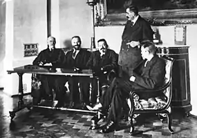 The Council of the People's Deputies after the USPD pulled out: Philipp Scheidemann, Otto Landsberg, Friedrich Ebert, Gustav Noske, Rudolf Wissell (from left to right)