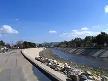 In the reach between San Juan Canyon and the city, San Juan Creek is not channelized, but does have some modifications along its length.[8] The Ortega Highway crosses the creek twice in this section, and notably at the first bridge, the creek channel is narrowed from 500 feet (150 m) to 100 feet (30 m). An access road crosses San Juan Creek near where it meets Bell Canyon, and at this point, the creek is diverted into 36-inch (91 cm) culverts. There are also gabions along San Juan Creek for some of its length, mainly preceding, at and after stream crossings. There are also two objects that form drops, but not impoundments, in the middle reach, one man-made and one natural. The man-made structure is a small gabion located at the entrance of Caspers Wilderness Park, which is near the west boundary of the Cleveland National Forest. The second is a natural sandstone outcropping below a bridge. The former is beginning to lose its original use and may be washed out by one large flood.[1][3][4]
