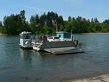 The river arrives at Spongs Landing County Park, then Spongs Bar and Lincoln Bar before passing Windsor Island and receiving Spring Valley Creek from the left at about RM 75 (RK 121). Slightly further downstream, the Willamette becomes the boundary between Marion County on the right and Yamhill County on the left and receives King Creek from the left. Here Willamette Mission State Park is on the right. Flowing by Beaver Island, on the right, the river reaches the Wheatland Ferry, which carries vehicles traveling on Wheatland Road. Beyond the ferry, the river passes the Wheatland, Upper and Lower Martine, Matheny, and Eldridge bars and receives Eldridge Slough from the right at about RM 69 (RK 111). Passing the Snaggy Bend, Allison, Fairfield, and Duke bars, the river reaches Lambert Bar and receives Lambert Slough from the left. The river flows around Five Islands, the Five Islands Bar and the Coffee, Weston, Candiani, and Mission bars before receiving the Yamhill River from the left 55 miles (89 km) from the mouth. About 2 miles (3 km) below the Yamhill, Chehalem Creek enters from the left, and then the river flows around Ash Island, where it receives High Water Slough from the right. Downstream of the island, the city of Newberg is on the left, 50 miles (80 km) from the mouth.[6][9][16]