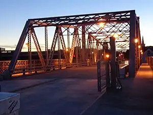 As of 2010, approximately 9,000 motor vehicles crossed the Court Street Bridge annually.[2] The bridge was closed for 26 months for rehabilitation in 2010–2012,[11] and has almost entirely been reconstructed. Its substructure, including abutments and piers, as well as electric mechanisms for the swing span, were replaced. The original trusses were restored to maintain the bridge's historic appearance.[12] The project was largely funded through the American Recovery and Reinvestment Act of 2009.[13] which provided $17.2 million for the $19.8 million project.[9][14]