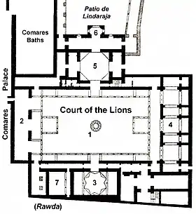 The palace is centered around a rectangular courtyard, which is surrounded on four sides by chambers and an arcaded gallery or portico. Many of the names for individual rooms were coined in Spanish after the end of the Reconquista and have little to do with any original Arabic names.[43]