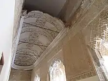 The hall consists of a central square space, acting almost like another courtyard, which is flanked by two niche-like side chambers. This kind of layout found in many other palace halls across the Alhambra.[50] The side chambers are separate from the central space by double arches. A short corridor, passing through multiple archways, separates the hall from the Court of the Lions. On an upper floor above this corridor is a small chamber with a window overlooking the courtyard, similar to a mirador (lookout).[50] The main central space of the hall is covered by a highly elaborate three-dimensional muqarnas dome ceiling, featuring a 16-sided cupola in the shape of an eight-pointed star. The cupola and the transitional zones around its base are all filled with muqarnas. Each of the cupola's 16 sides is pierced by a window. Inscriptions in the hall by Ibn Zamrak compare this dome to the heavens, the sun, the moon, and the stars. The upper walls of the chamber are covered in more stucco decoration, while the lower walls are covered with tile decoration. The original tiles were replaced in the 16th century with contemporary tiles from Seville.[50][52]