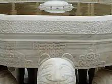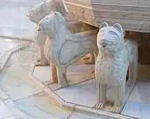 The central fountain of the courtyard, which has been modified and restored several times over the centuries, consists of a bowl-like marble basin surrounded by twelve lions. The lions face outwards and appear as if supporting the basin on their backs. All these components are made of Macael marble from Almeria.[69][70] The existence of fountains with lion sculptures is documented at other sites of al-Andalus such as the earlier Medina Azahara near Cordoba.[71]:168–169 Other zoomorphic sculptures from al-Andalus are also attested, such as the larger example of the Pisa Griffin.