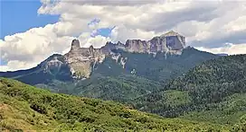 Courthouse Mountain is a 12,152-foot-elevation (3,704-meter) mountain summit located on the shared boundary of Hinsdale County with Ouray County, in southwest Colorado, United States.[3] It is situated 10.5 miles east of the community of Ridgway, and south of Owl Creek Pass, in the Uncompahgre Wilderness, on land managed by Uncompahgre National Forest. It is part of the San Juan Mountains which are a subset of the Rocky Mountains, and is situated west of the Continental Divide. Topographic relief is significant as the east aspect rises nearly 2,000 feet (610 meters) above West Fork Cimarron River in approximately one-half mile, and with its prominence can be seen from Highway 550 near Ridgway. The mountain's name, which has been officially adopted by the United States Board on Geographic Names, was in use before 1906 when Henry Gannett published it in the Gazetteer of Colorado.[3][5]