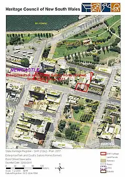 1. 1 2 3 4 5 6 7 8 9 10 11 12 13 14 15 16 17 18 19 20 21 22 23 24 25 26 27 28 29 30 31 32 33 34 35 36 37 38 39 40 41 42 43 44 45 46 47 48 49 50 51 52 53 54 "Enterprise Park and Coutt's Sailors Home (former)". New South Wales State Heritage Register. Department of Planning & Environment. H01842. Retrieved 2 June 2018. Text is licensed by State of New South Wales (Department of Planning and Environment) under CC-BY 4.0 licence.