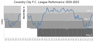 The club continued their good form in the second tier, finishing eighth, fourth and fourth again between 1936 and 1939.[37] They also constructed a new main stand and purchased the freehold of Highfield Road, utilising a loan of £20,000 from local motor-industry entrepreneur John Siddeley.[38] In 1937–38 they met with Midlands rivals Aston Villa the first time in league football, securing with a win and a draw in the two meetings as well as a higher-placed finish than the Birmingham club.[39] In September 1939, the league season was aborted after three games due to the start of World War II.[40] Many supporters at the time blamed the war for robbing the team of a probable imminent promotion to the First Division, although several top players including Bourton had been sold by 1939, and attendances had begun to fall.[41] Coventry continued playing some friendly games until November 1940, when the Coventry Blitz damaged the stadium and brought all football in the city to a halt. Friendly matches resumed again in 1942, as parts of Highfield Road had been rebuilt, and the team joined the Midland Regional League.[40]