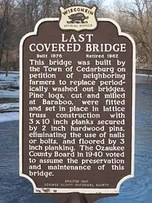 - 1 2 "Last Covered Bridge (Built 1876, retired 1962) (Historic Marker Erected 1965)". Wisconsinhistory.org. Archived from the original on October 22, 2012. Retrieved July 22, 2012.