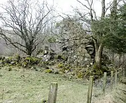 Two abandoned buildings, standing about 20 metres (65 feet) apart are recorded on the 1st edition of the Ordnance Survey 1:2500 map standing respectively within a rectilinear enclosure.[25] One of these buildings was a range containing two compartments of unequal size. An outbuilding projected from the south-west end of the range. The totally demolished building was 'L' shaped in plan[26] and had been removed by 1897.[27]