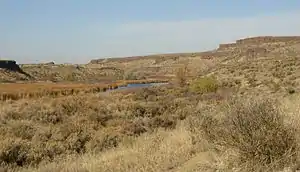 Crab Creek is a stream in the U.S. state of Washington. Named for the presence of crayfish,[7] it is one of the few perennial streams in the Columbia Basin of central Washington, flowing from the northeastern Columbia River Plateau, roughly 5 km (3.1 mi) east of Reardan, west-southwest to empty into the Columbia River near the small town of Beverly. Its course exhibits many examples of the erosive powers of extremely large glacial Missoula Floods of the late Pleistocene, which scoured the region. In addition, Crab Creek and its region have been transformed by the large-scale irrigation of the Bureau of Reclamation's Columbia Basin Project (CBP), which has raised water table levels, significantly extending the length of Crab Creek and created new lakes and streams.[5]