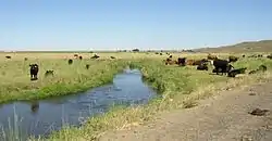 Prior to establishing irrigation, most of the areas along Upper Crab Creek were bunchgrass prairie, which was suited to range cattle and sheep. Crab Creek and tributary creeks provided water for the herds. Although a handful of ranchers ran herds, shipping their bunchgrass-fed beef to Montana by rail from towns like Sprague, settlement remained extremely sparse. One such example was George Lucas, an Irish emigrant, who was Adams County's first permanent white settler. He established a way-station and raised cattle and horses at Cow Creek along the road to Fort Colville in 1869.[10]