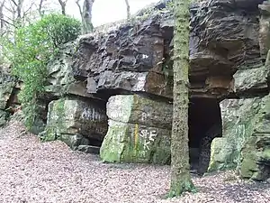 Crank Caverns[1] is the common name of the remains of the Rainford Delph Quarry near Crank in St. Helens, Merseyside, England. It is a vast network of old tunnels and caverns, with very little known about the owners or workers of the tunnels. It appears that the main portals are much newer than the deeper tunnels found behind the tight squeeze through the gated entrance.[2] Information in the St. Helens local history archives states that sandstone quarrying began here as early as 1700. The 1840s Ordnance Survey refers to the quarry as Rainford Old Delph. The woodland surrounding the caverns were used as a game reserve by the Earl of Derby until 1939, when they became a storage facility for ammunition for the anti-aircraft position at Crank. After the war, the caverns ceased use as a game reserve. Today, Crank Caverns are still physically accessible from a nearby public footpath, and despite the fly-tipping of rubble, shredded plastic and animal waste from the nearby Rainford Delph Farm. It is still a draw for generations of curious locals who wish to explore, many having heard the numerous local myths and legends from an early age.[3]