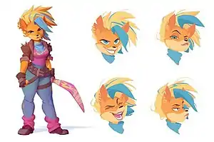 The statement set for the game's tone was summarized as "Jackass meets Looney Tunes", which Toys for Bob studio head Paul Yan defined as "barreling into danger [with the] silliness and wackiness of Looney Tunes" while recognizing the latter source as a primordial influence on the series.[21]: 9:43 In order to solidify this tone, the development team set updating Crash's design for the new game as their earliest task, which prompted conversation within the art team attempting to determine Crash's personality. They eventually honed in on what Nadelberg described as "this dude who's always in the wrong place at the wrong time" who "just manages to get himself out of all these crazy situations in a heroic way, but he's not your classic hero". The team's concept artists created various designs for Crash, with Kole being tasked with combining the most suitable elements from each iteration. Kole did not find photographic references to real bandicoots helpful in the design process, as his attempts to incorporate them resulted in a deviation from the character's spirit; Kole likened Crash's general design to an artist's attempt at drawing a bandicoot from memory a couple years after having seen one.[33] Artist Ryan Jones took the liberty of omitting Crash's flesh-colored lips in favor of a simpler two-toned fur treatment, which was incorporated into his final design.[34] Crash's lack of a neck was the most difficult aspect of his design for the development team's modelers to translate; as Kole observed: "He's just shoulders and then a head. It was actually kind of a big technical challenge to pull that off just right."[33] Coco's redesign, meanwhile, required only minor adjustments, aside from updating her laptop to a tablet.[35]