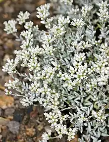 Its habitat is usually shallow soil on rocky ledges or very rocky soil on lower mountain slopes. It is sometimes also found in rock cracks in mountain ranges at higher altitude. In exposed positions the plants are smaller, often decumbent, and can be covered in a dense silvery waxy powder.[3]