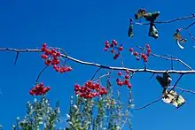 Crataegus phaenopyrum is a species of hawthorn commonly known as Washington hawthorn or Washington thorn.[1] It is widely grown as an ornamental plant, and can reach 10 m (about 32 feet) in height. The small red berry-like fruit grow closely together in large clusters and are food for squirrels and birds. They have a mild flavor and can be eaten raw or cooked. As with other species of hawthorn, the wood is hard and can be used to make tools.