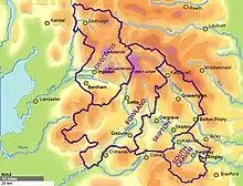 In 1086 Roger of Poitou was Tenant-in-chief of the western side of Craven: Ribblesdale and the Pendle valley.[24] In 1092 he was granted also Lonsdale to defend Morecambe Bay against Scottish raiding parties.
