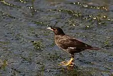 The crested myna (Acridotheres cristatellus), also known as the Chinese starling, is a species of starling in the genus Acridotheres native to southeastern China and Indochina.[2][3] It is named after the tuft of feathers on its forehead that resembles a crest.[3]